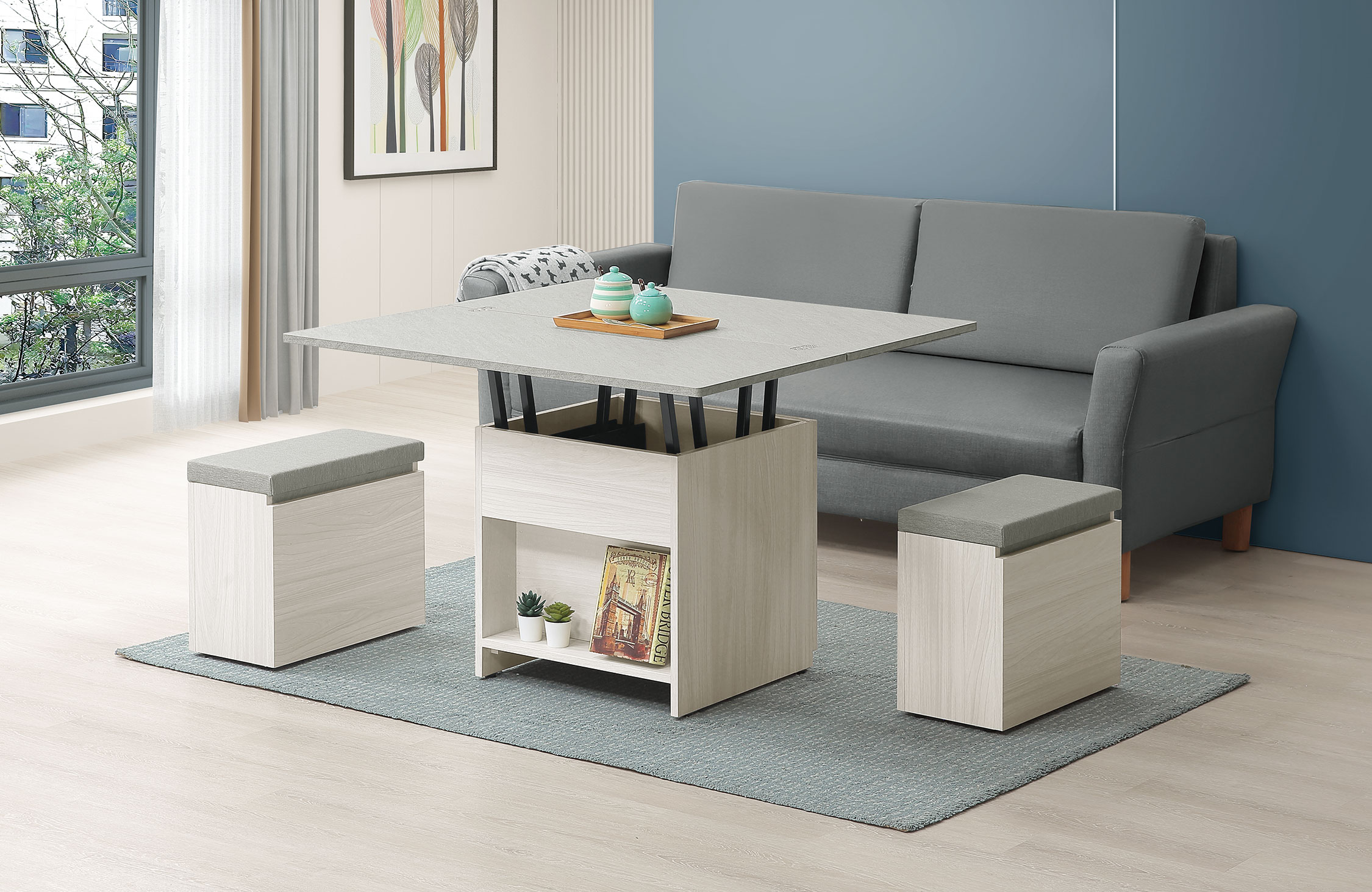 黛拉3.3尺雙升降大茶几 收合:寬100x深52x高57(公分) 展開:寬100x深104x高73.5(公分) B2298 (163400) (附2張可置物輔助椅.附2顆活動輪) (輔助椅尺寸:寬24x深48x高42cm) (油壓升降五金) |