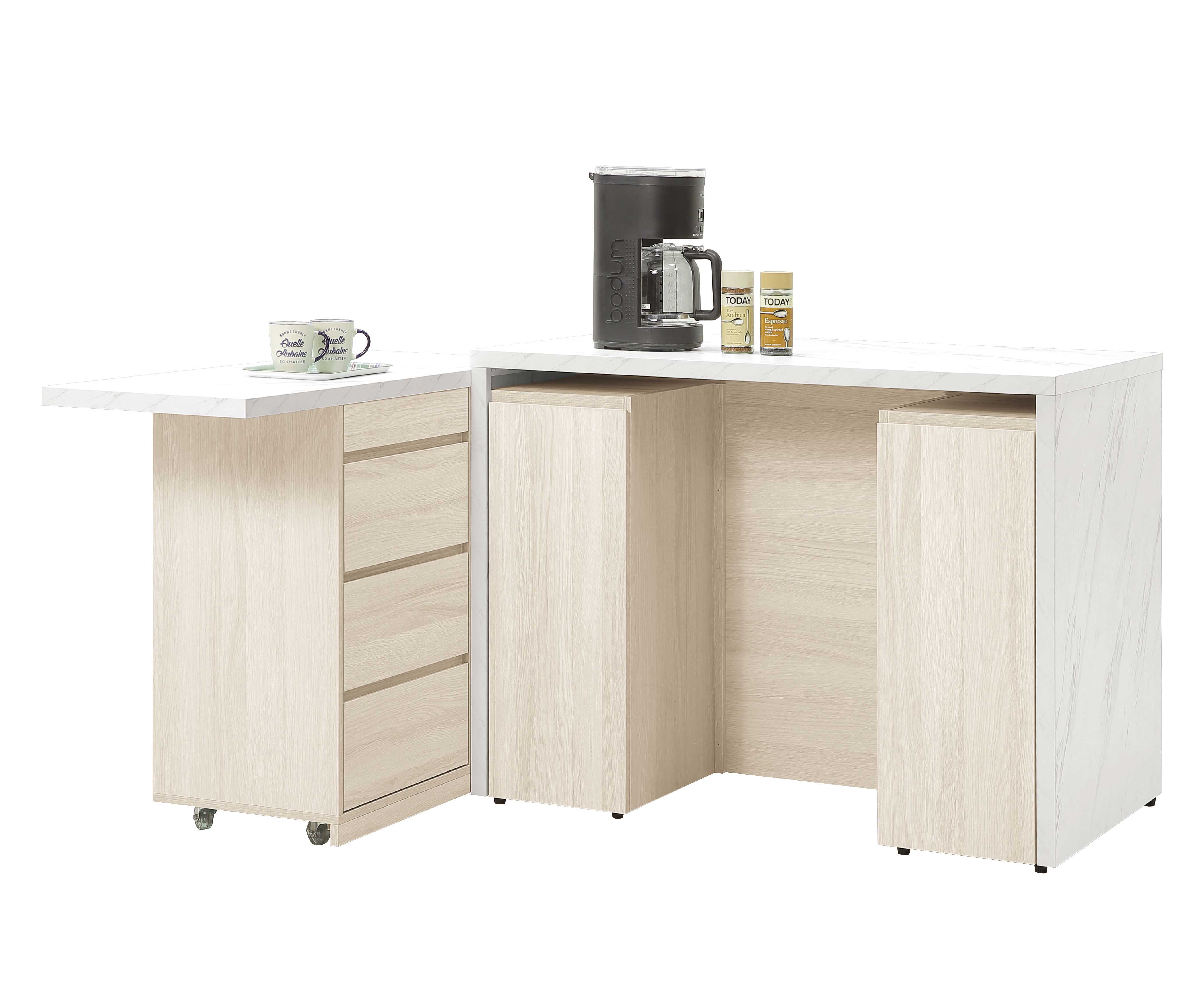 潔妮詩4尺中島櫃 寬120.2x深70.2x高91.8(公分) (207500) (左右門片內各附1片活動隔板) (附萬用輪煞車x2固定x2,移動更輕鬆) (仿大理石紋美耐皿桌面) |