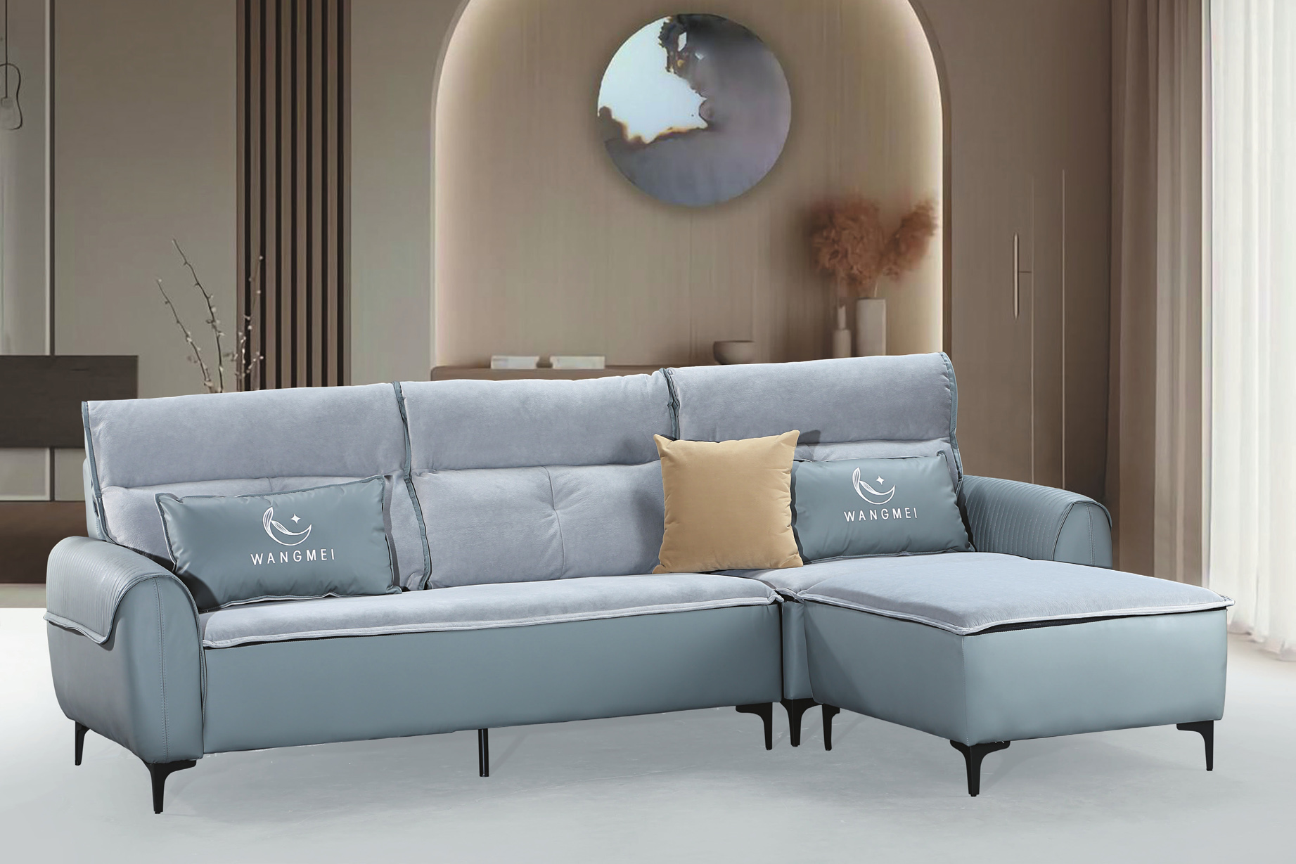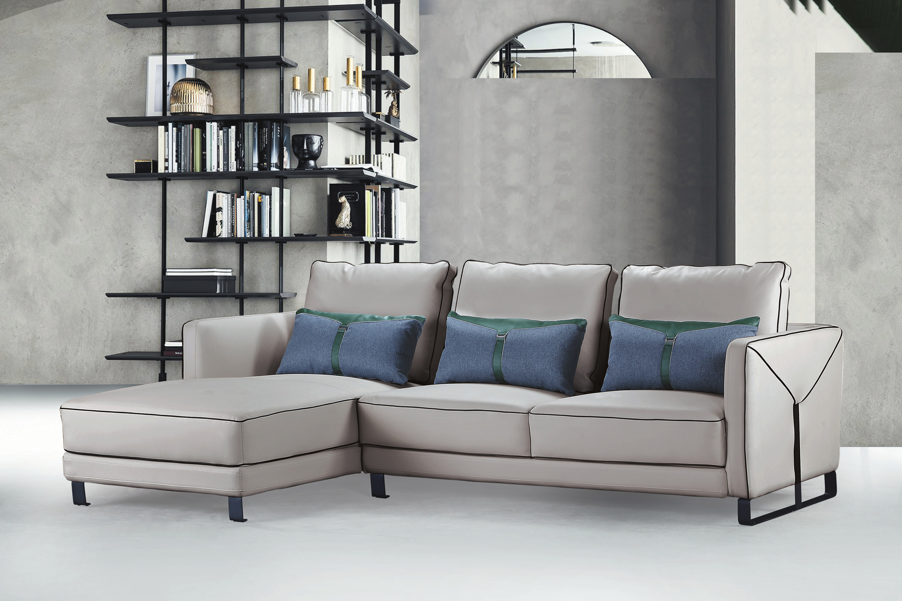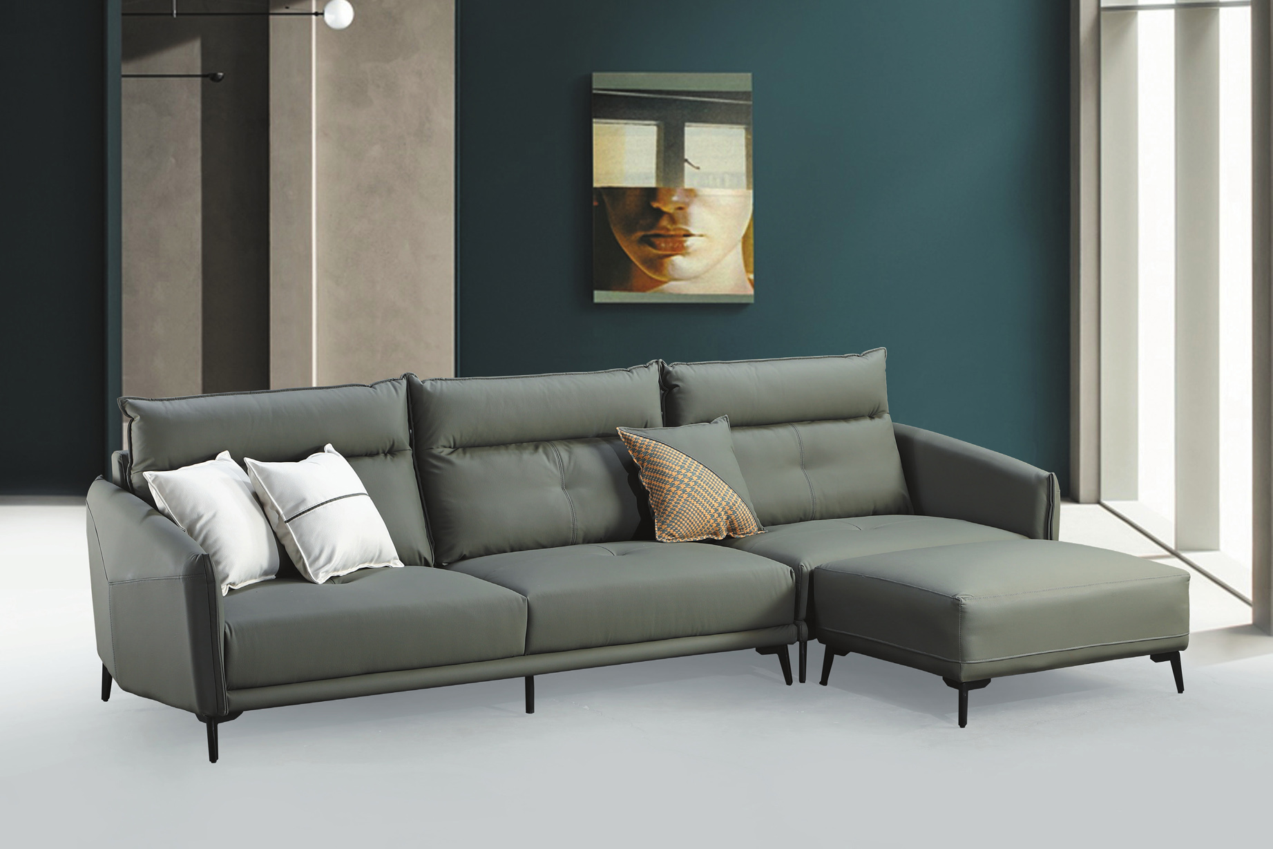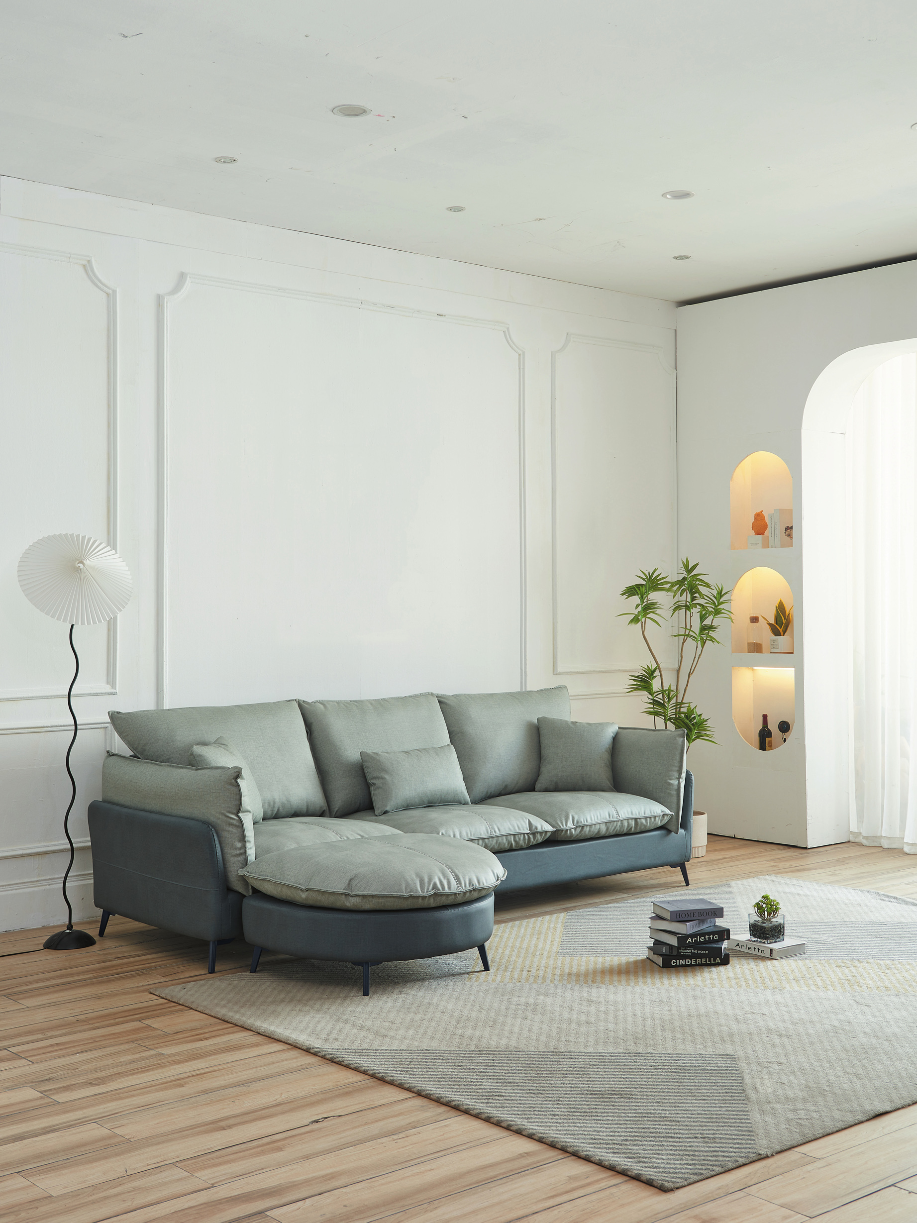 尤軒L型淺灰皮沙發