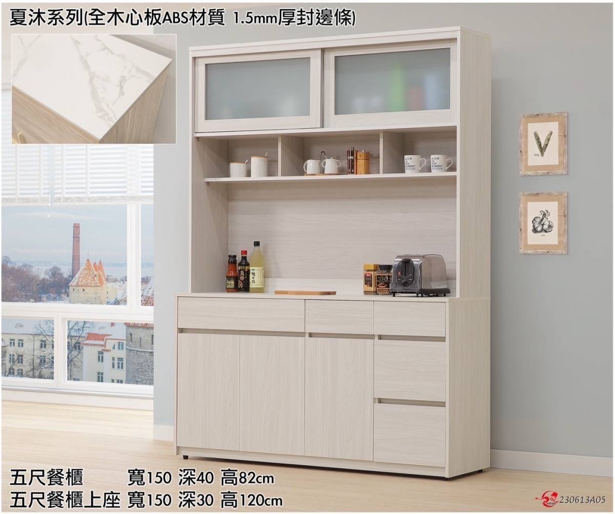 5尺餐櫃上座.:寬150 深30 高120 4尺餐櫃下座.:寬120 深40 高82 4尺餐櫃上座.:寬120 深30 高120 |