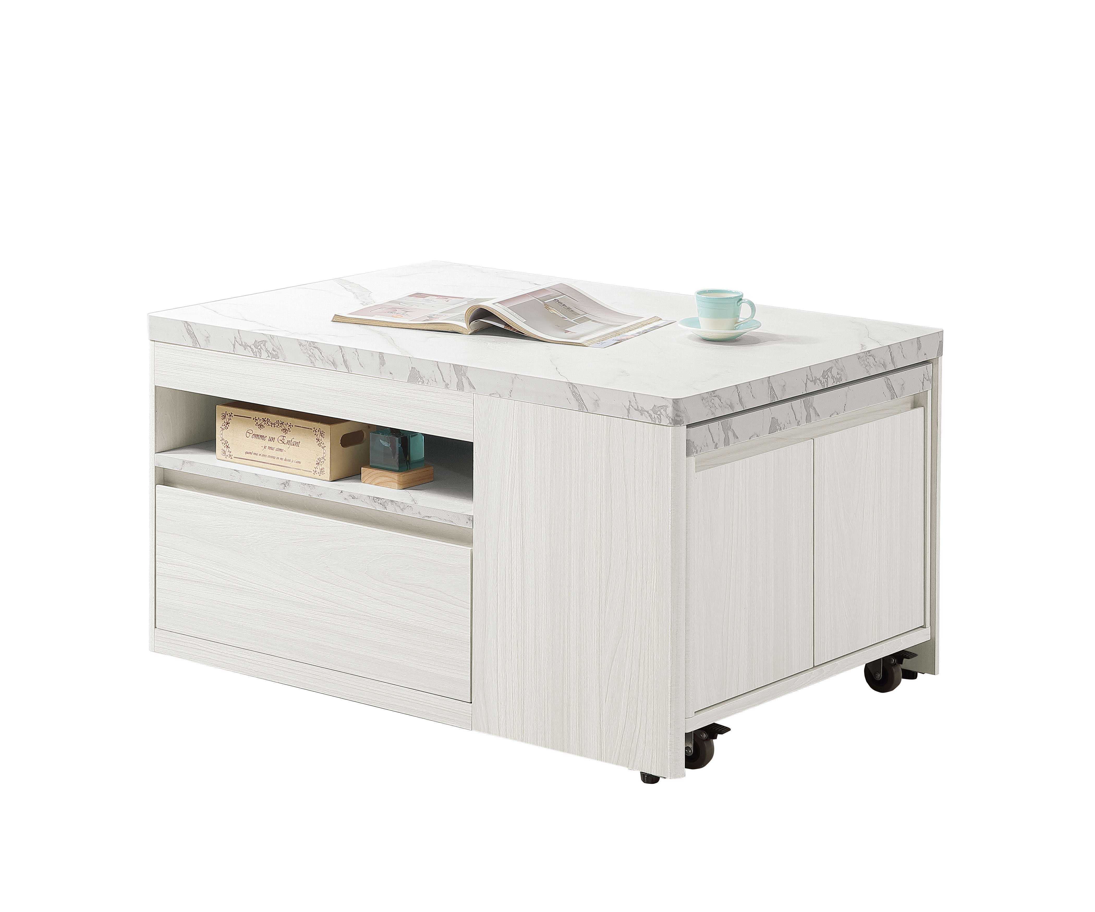 蘿拉3尺多功能伸縮茶几 寬90~143x深60x高48.5(公分) A22755 (125900) (附1張貓抓皮收納型腳椅) (可移動煞車輪x2顆) (腳椅尺寸:寬55.5x深29x高30cm) (開門內無隔板)(仿大理石紋美耐皿桌面 |